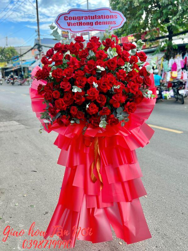 Hoa Khai Trương (HKT – 97) mang tone màu đỏ rực rỡ được kết từ hoa hồng đỏ . Hoa hồng là loài hoa với đa dạng màu sắc và những ý nghĩa đặc biệt. Hoa hồng đỏ tượng trưng cho sự đam mê, nhiệt huyết và sự hoàn hảo. Bên cạnh đó, màu đỏ cũng là màu tượng trưng cho sự may mắn, tài lộc rất phù hợp với những buổi lễ quan trọng như ngày lễ khai trương. Gửi tặng lẵng hoa đến khách hàng và người thân của bạn nhân ngày trọng đại để chúc mừng khai trương hồng phát, công việc và cuộc sống luôn vui vẻ và rực rỡ như những đóa hoa này.
